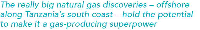 The really big natural gas discoveries – offshore along Tanzania’s south coast – date back to 2011 and hold the potential to make the country a gas-producing superpower. Including later discoveries, as well as some onshore, the 2016 figure for recoverable gas reserves is 57 trillion cubic feet, giving it a potential at least twice the size of the UK’s North Sea gas fields. While a final decision on the building of an export facility – a liquid natural gas ‘train’ – has not yet been made, the resource has already made a big difference to Tanzania’s energy security.