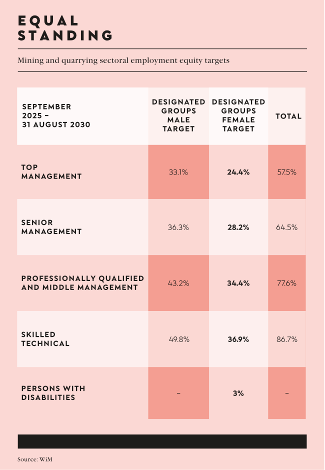 The Commission for Employment Equity’s annual report puts the industry halfway to its goal, topping 20% in 2024 – but that figure has doubled since 2020, when the MCSA introduced its Women in Mining (WiM) initiative. It has also more than tripled since 2009, when women made up a paltry 6% of the mining workforce. Women now represent 21% of top management, 25% of senior management and 30% of professionally qualified and mid-management jobs.
